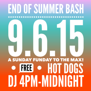 THIS SUNDAY! DRINK SPECIALS ALL DAY LONG! BOOZY BRUNCH // 11AM-4PMHAPPY HOUR // 11AM-10PMDJ // 4PM-MIDNIGHTFREE HOT DOGS!LET'S END THE SUMMER RIGHT!